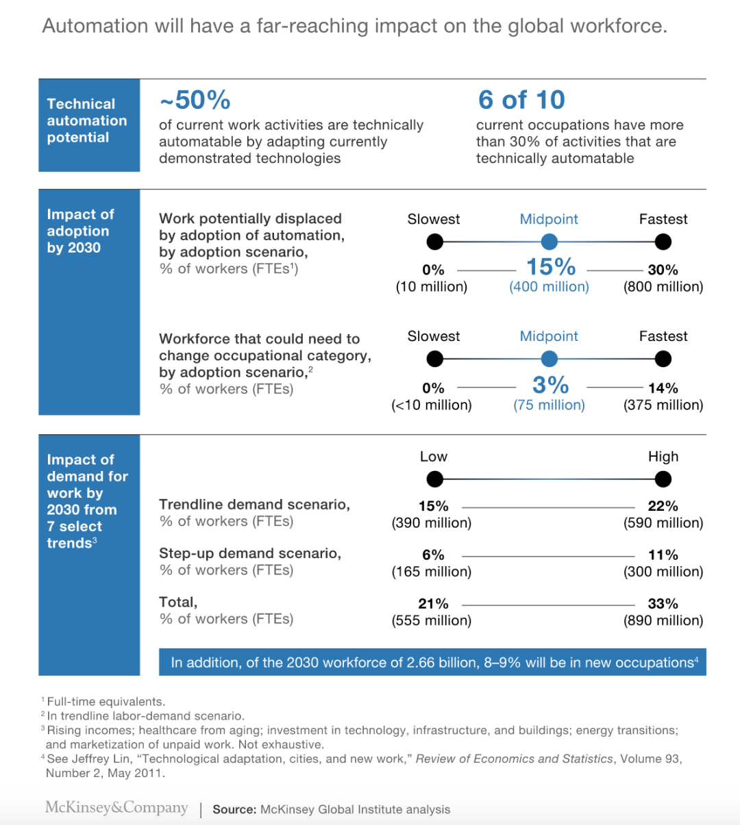 据全球顶尖咨询公司McKinsey调查报告Jobs lost, jobs gained:What the future of work will mean for jobs, skills, and wages一文中显示,全球最高达50%的工作可以被机器人取代;六成工作岗位,其30%的工作量可以由机器代劳;到2030年,保守估计全球15%的人(约4亿人)会因人工智能工作发生变动,激进预估会影响到30%的全球人口,换算成数字的话也就是8亿人。