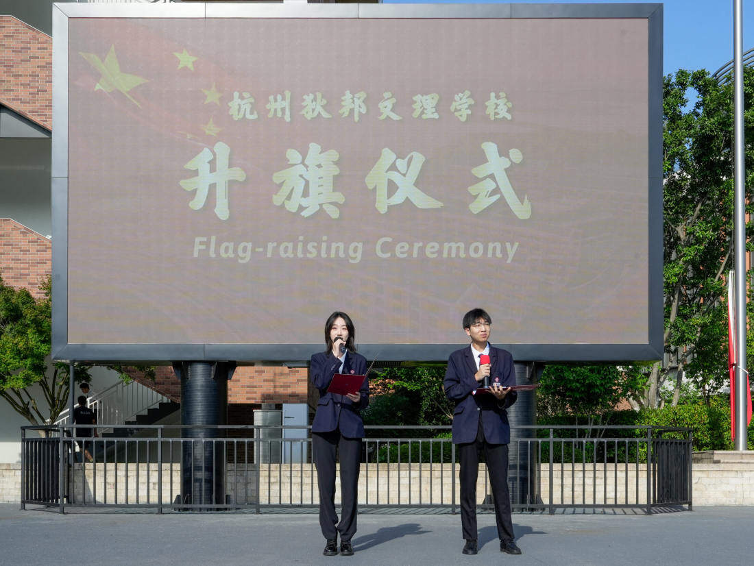在阳光明媚的早晨,杭州狄邦文理学校全体师生齐聚于操场,共同参与了新学期的第二次升旗仪式,同时为即将到来的教师节献上了最诚挚的祝福。